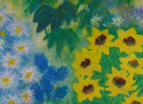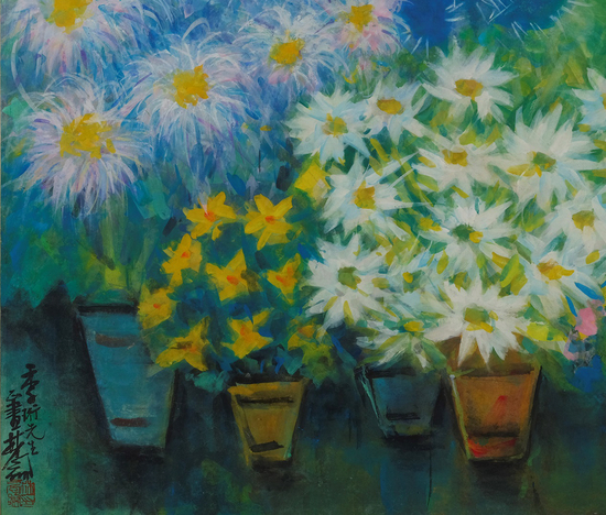 画面中,物象的造型不求形似,不刻意追求形态之间的关系,线条浑厚、流畅而简洁,富于变化,国画中的大写意精髓被灵活地运用到各种花卉之中,使得画面更加富有生活情趣,绚烂、激情、诗意被完美地结合在一起。