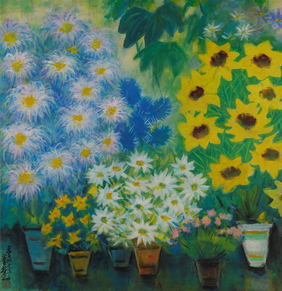 林风眠对色彩的把握和运用有着异乎常人的灵性与敏感,这是他“以西入中”最直接的体现。图中花卉繁茂似锦,五彩缤纷,品类有七、八种之多,而用色却繁而不乱,信手拈来,对于色彩的敏感与大胆,使得画面艳丽缤纷,强烈的视觉效果令画面具有极强的视觉冲击力。