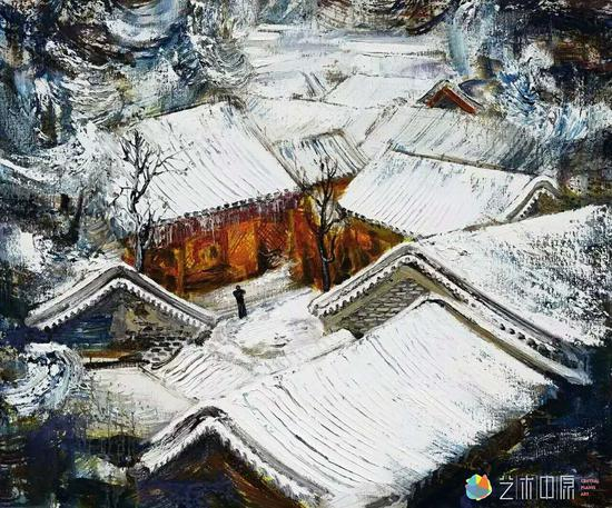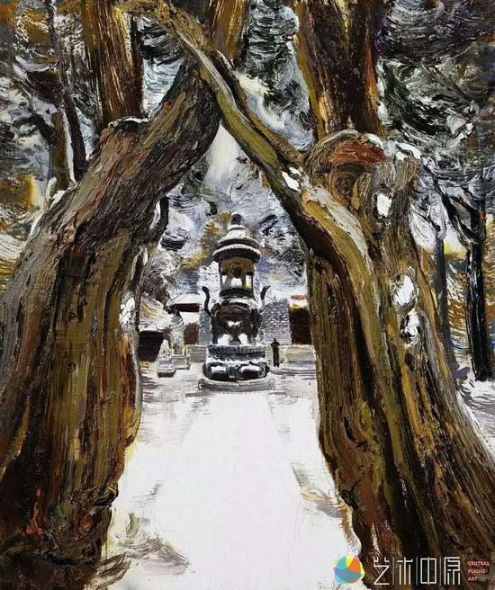他的风景中有扯不断的乡土情结,有农耕文化的一些符号,有天地、有村舍、有耕种、有马匹;有眺望、有守护、有听泉、有赏雪,他表现的不是寻常那种带有人间烟火气的民间的喧闹和热烈,它的侧重点不在民居民俗,反而是一种孤独、清冷却又自适、自得的个人心境,是自我的隔离,心灵的栖居,它远离人群,是与大自然和谐共处的安然和自在。这是带有精神性和文化色彩的乡土之梦。