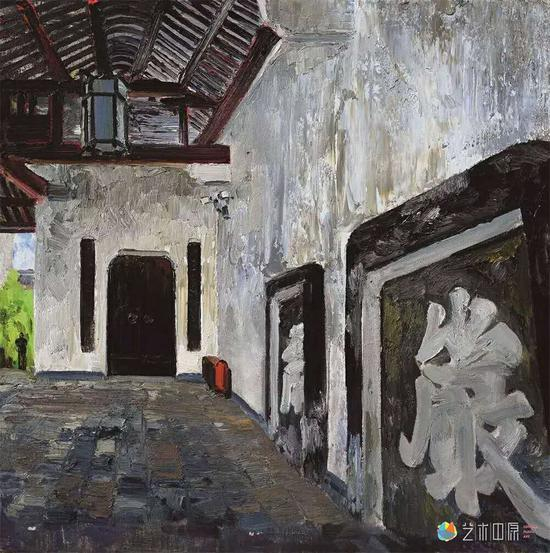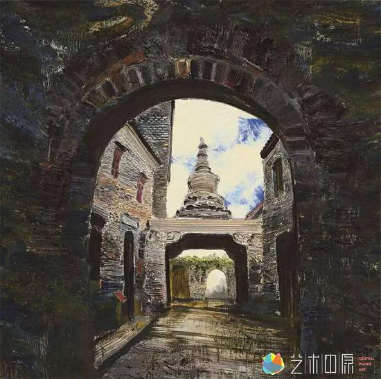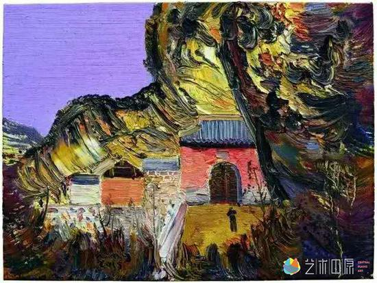 其四是人性的力量。孟新宇画的是风景画,但是不妨说他画的其实是含有中国精神的山水画。他最喜欢宋元山水,他的画也是向宋元山水的致敬。除了风景,他画了大量的遗址、寺庙题材,那也是他向古而生的向往。他的情怀,他的理想,他的浪漫,他的孤独,他的得意,他的美好,其实都被放置在了作品中,而标志就是画里那个无所不在的身影。他很小,却很醒目,在小道上,在门缝间,在高峰处,在亭台中,它代表孟新宇完成着与这个世界的对话。这种表现方式显然不是写生环境中的点缀需要,而是一种人性的自然显现,特别让人有共鸣。