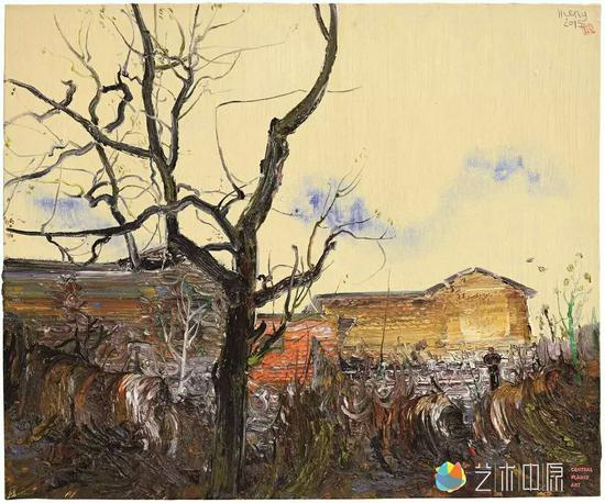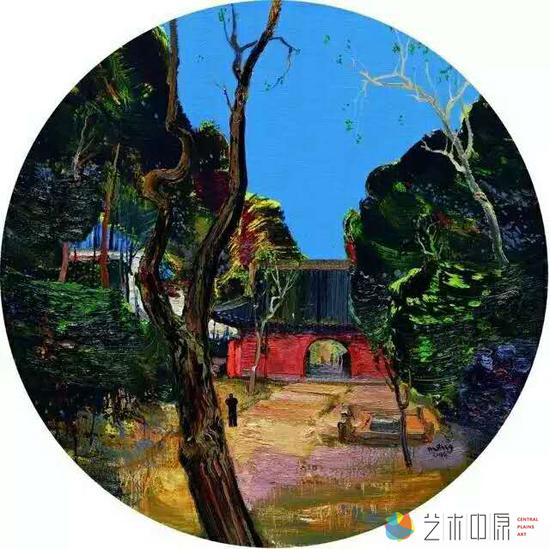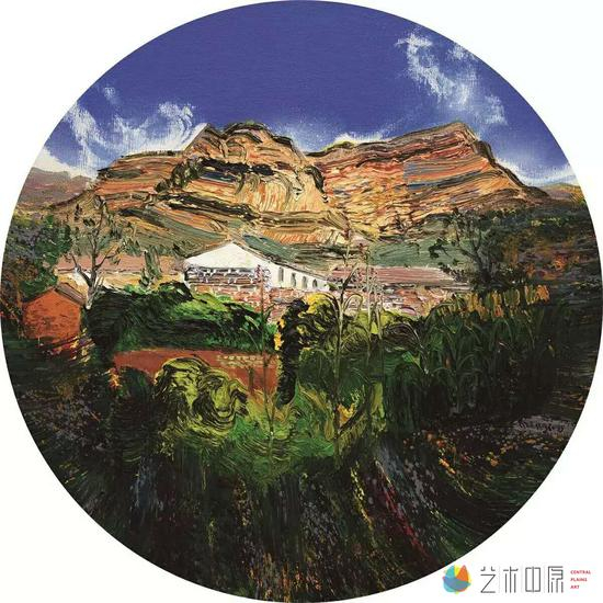 比如他的构图暗合中国传统文化的意蕴美。孟新宇作品中的构图与传统的西方油画的构图样式,比如十字形、三角形、S形、垂直形、平行线等等,是不太一样的,更近于中国画的传统构图模式。看他的太行四季组画,构图采用三段式,上面是蓝天,下面是厚土,中间是屋宇,指向的是中国传统的天地人概念。还有他的圆形构图,焦点中间是清晰的,而边缘会有意模糊化,展示出的效果就是天圆地方的中国传统文化形式。他的作品中也喜欢采用中国国画比例的尺幅构图。