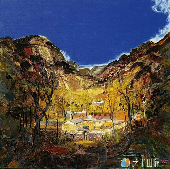 比如他的色彩有超出常态的纯粹美。看他的太行山系列作品,画面中那种比蓝更蓝,比黄更黄,比黑更黑的色彩直入眼帘,不容回避。色彩的这种纯度在现实中你是看不到的,但是却切合于人的想象,虽有点夸张,却一点也不过分,比如更蓝的天,更黄的土,更灰的瓦,更绿的植物……这使孟新宇画中的色彩有种出乎意料的亮色和纯度。这种亮色的效果使孟新宇的作品有了如梦境一般的干净、透彻。
