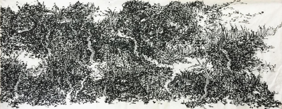 在黄宾虹先生的画学思想中,最重要的观点就是“书画同源”。他说:“画源书法,先学论书。笔力上纸,能透纸背,以此作画,必不肤浅”,“用笔之法,从书法而来”, “中国画法从书法来,无往不复,无垂不缩,妙有含蓄,不可发露无余”。从几千年的中国美术史来看,书法家一般都能绘画,一个出色的画家必须首先是一个好的书法家,因为绘画的笔法就来自书法的用笔方法。中国画的用笔之法包括起笔、运笔、收笔三个部分,起笔和收笔讲究逆入藏锋、自然含蓄,运笔要以中锋用笔为主,在行笔的过程中要有力度。(也就是古人讲的折叉股、屋漏痕、锥画沙、印印泥)讲究一波三折,追求的是 “力透纸背”、“骨法用笔”、“力能扛鼎”,一种柔中带刚的味道,仿佛如一条出洞的灵蛇,有好像一根千年的老藤,充满了一种蓄势待发的爆发力和张力。用墨则讲究浓淡干湿宿焦积等墨法,以多种变化的墨法形成墨色的丰富的变化,从而来表现大自然的万千气象。
