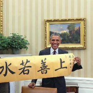 8月7日上午,正在纽约的华东师范大学教授、书法家周斌透露,8月6日晚,他去联合国秘书长潘基文官邸,潘基文十分高兴地向他描述了他送汉字书 法作品《上善若水》给奥巴马总统的情景。当时奥巴马十分高兴,他准备把这件作品挂在总统府博物馆中。8月4日,潘基文从纽约赴华盛顿,与奥巴马有一个长时 间的会晤。当天恰逢奥巴马的54岁生日,他遂将自己写的书法作品《上善若水》作为联合国礼品赠送给奥巴马。此件作品为汉字颜体书法,右上题有“奥巴马总统 阁下雅正”字样。据现场图片显示,收到这份礼物时,奥巴马脸上乐开了花。