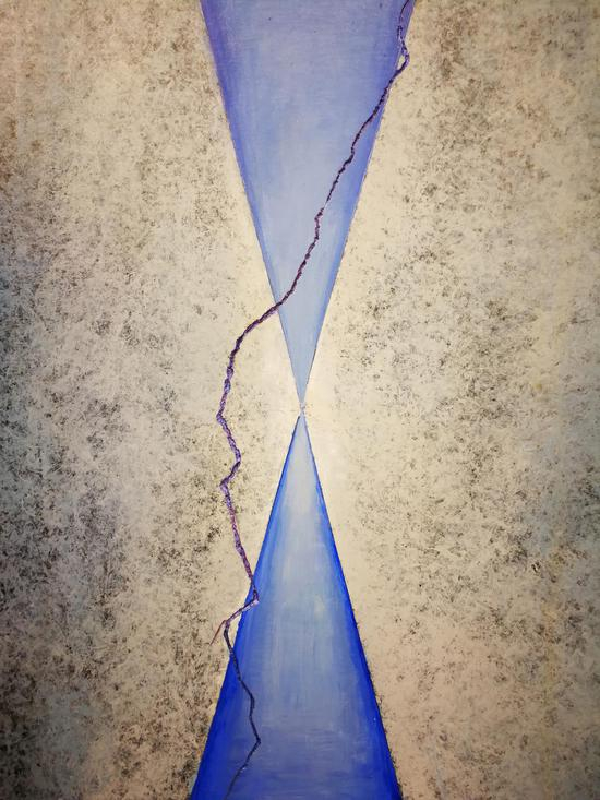 那里是超越黑暗。蓝色超越黑色,是姚运对色彩的洞观。与罗斯科一样,她选择最直接的方式去设置“色彩”,直接到能够让观者直达神秘的信仰和情绪。但这对姚运并不神秘,在故乡——黔东南的巫文化空气中,祖辈面对生死问题却发出自然而轻松的歌唱,这让一切带有“问题意识”的浓烈而抽象的色彩,都化为我们对生命和生活的清晰的想象。因此,裂缝、衬托裂缝的冷抽象格子、黑色、超越黑色的高感度蓝色,反而让人愉悦,就像我们已看清人类的历史。