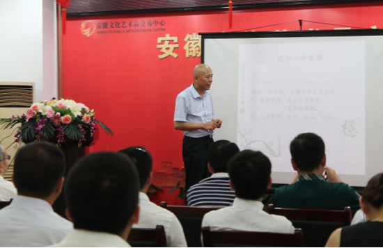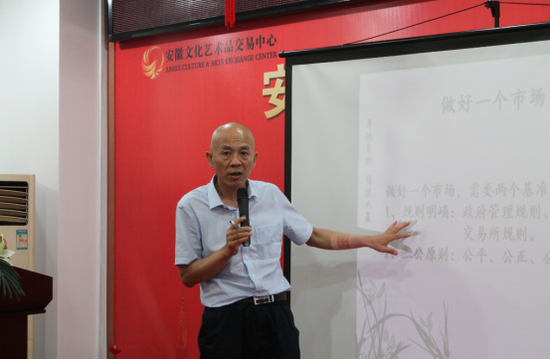 8月10日下午,安徽文化艺术品交易中心多功能厅,中国红埔金融研究院、上海铸铭投资董事长张向阳,正以生动的案例论证一个成熟、安全的投资市场的重要性。这场由安徽文交中心主办的投资实战分享会受到不少艺术品投资爱好者的关注,活动当天安徽文交中心所有已挂牌艺术品的挂牌人悉数到齐,以及部分远在外地的经纪会员都特意前来参加此次分享会。
