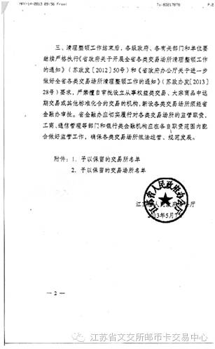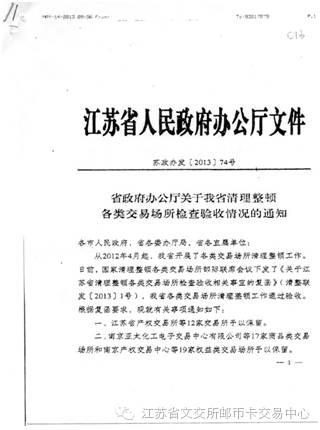2013年,根据“江苏省政府办公厅关于我省清理整顿各类交易场所检查验收情况的通知”,江苏省文交所正式通过国务院部际联席会议验收并予以保留。