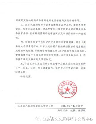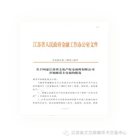2014年4月,江苏省文交所得到了江苏省金融办的批复,成为全国首家参与邮币卡业务的国有文化产权交易所。同年5月19日,邮币卡交易中心首批藏品正式上线。