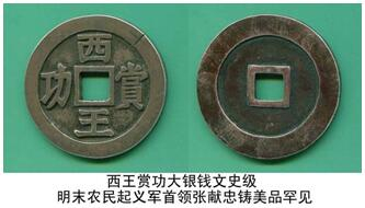 明代末期,农民起义军领张献忠率军南征北战,节节胜利。在封为定西王的时候,他别出心裁地发行了一种“西王赏功”钱,以此作为军功奖章,赏给有功的将士。这种“西王赏功”也有金、银、铜三等。当时这类钱起了鼓舞士气的作用。但是后来起义失败,他们却成了罪证,于是军功钱币很快地消失了。时至今日,这类钱币成了十分罕见的大珍品。