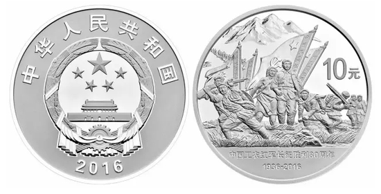 30克圆形银质纪念币背面图案为中国工农红军过雪山、草地的典型形象,并刊“中国工农红军长征胜利80周年、1936-2016”字样及面额。