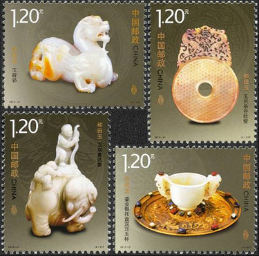 2012年8月29日我国邮政部门发行了《和田玉》特种邮票1套4枚、小全张1枚,为配合中国邮政发行《和田玉》特种邮票四枚邮票以及小全张,中国集邮总公司还于邮票发行当日特别发行了《和田玉》特种邮票首日封以及小全张首日封,套票首日封全套两枚,首日封首枚贴套票一、三图,第二枚贴套票二、四图,发行量20万枚。