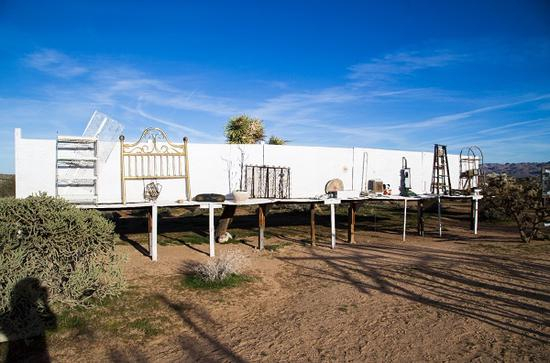 今天的约书亚树沙漠已经大为人工化和浪漫化,这里有成型的艺术家小团体,比如我借住的来自伦敦的艺术家夫妇就深受诺亚艺术的影响,特地选址在离这座美术馆不远的地方建房,他们参与普利弗伊基金会的活动,作为艺术导览或是工作坊的老师。但在80年代,诺亚是第一批从洛杉矶搬来定居的艺术家。当时,所有的艺术家都还在纽约挤破头,连洛杉矶都划不进艺术圈关注的版图中。以社会现实和实践主义为创作导向的艺术家,摒弃了城市文明,搬到粗粝的旷野之中,日复一日、夜复一夜地在毫无援助的孤独中,搜集被当作垃圾丢弃的废旧材料,凭借毫无逻辑的直觉力,将它们重新搭建起来,其中的每一次剪切、断裂、拼接、打桩、攀爬,都是自己和自己的斗争与合作,没有助手、观众、评论人。