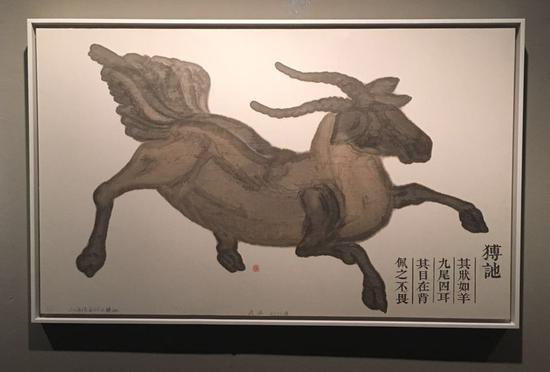 武宏 《山海经系列:鹿蜀、猼訑、䰷鱼、旋龟》 纸本水墨 70×140cm / 每件 2013年 作品由艺术家提供,北京 在现实体验可以被虚拟, 智能甚至可以被创造的时代, 人似乎开始享受造物主的能力。而面对这些源自中国古代传说的动物,我们不禁发问, 今日转基因能带来变异, 那么上古奇观, 为何不能是真实的呢?我们真的了解过去吗?终究我们是否还在自然和未知面前保持着谦卑?我们是否依然尊重天真的想像, 以及灵魂的无尽可能?