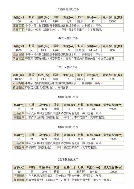 之前已介绍过其第1、2组已分别于2009年8月、2010年3月发行。此次发行的《水浒传》彩色金银纪念币(第3组)背面图案分别选取了“智多星吴用”、“呼延灼月夜赚关胜”、“齐聚忠义堂”、“小李广花容”、“黑旋风李逵”、“燕青智扑擎天柱”等在《水浒传》中脍炙人口的英雄和故事。至此,中国人民银行陆续发行的中国四大古典文学名著贵金属纪念币系列已全部发行,该系列将成为中国贵金属纪念币宝库中一朵永远绽放的奇葩。详情参见图解: