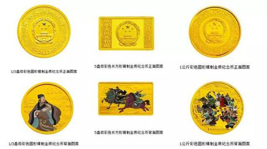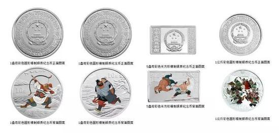 《水浒传》彩色金银纪念币(第3组)——该套金银纪念币图案设计在人物造型和整体表现上吸取借鉴了中国传统工笔画风格和着色方法,主体人物饰以鲜明的色彩和富有表现力的线条,在背景浮雕对比下,烘托了古朴与现代的艺术色彩。其中,该套金银纪念币正面图案以中华人民共和国国徽及中国传统吉祥纹饰组合设计,并刊国名和年号;背面图案则综合运用了镜面、喷砂、彩色、浮雕等诸多国家级造币工艺,更加完美的表现了该套币的造型美感和铸造精致,彩印的人物形象准确自然、栩栩如生。