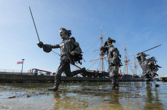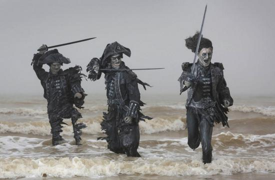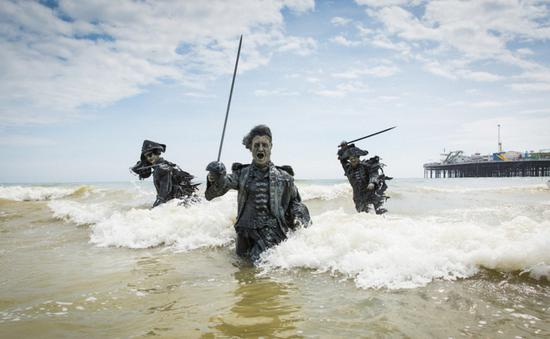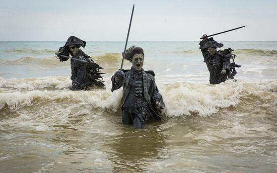 2017年5月25日讯(具体拍摄时间不详),英国伊斯特本,游客在英国海岸线惊讶地发现一系列海盗雕塑。这些设立在布莱顿海滩的独特艺术装置,是由华特迪士尼工作室推出宣传新电影《加勒比海盗5》。这些2米高的雕塑纷纷代表了电影的角色,例如:大反派萨拉查船长,在今天清晨退潮时浮出水面。