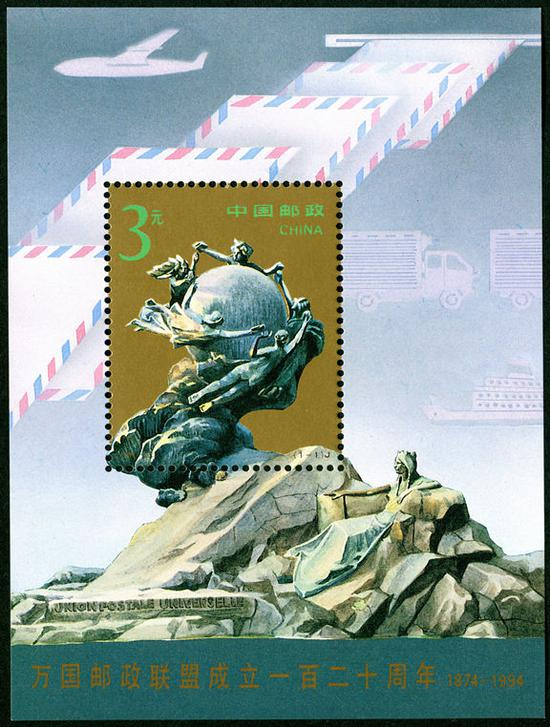 1994年10月9日,为了纪念万国邮政联盟成立120周年,邮电部发行了《万国邮政联盟成立一百二十周年纪念》纪念邮票,全套小型张1枚。小型张主图为万国邮政联盟纪念碑,邮票选取纪念碑上青铜塑造的五个不同种族、不同服饰的环绕着地球飞翔的女信使,她们正在互相传递着信件。背景为各种邮政运输工具和从邮箱飞出的航空信件。