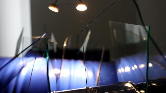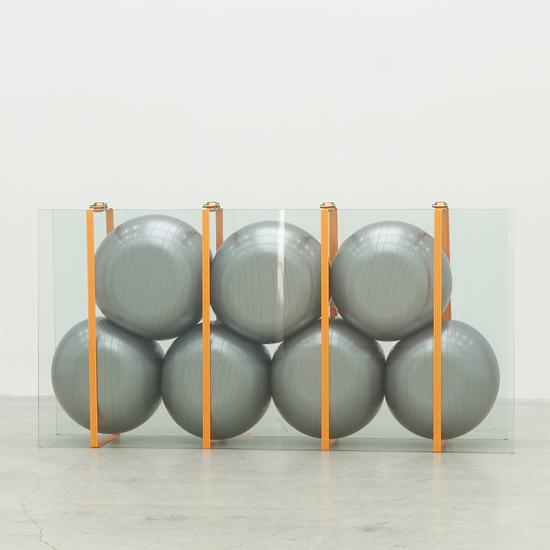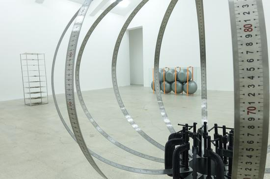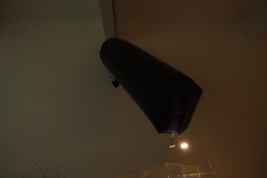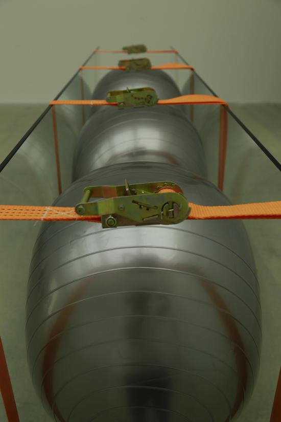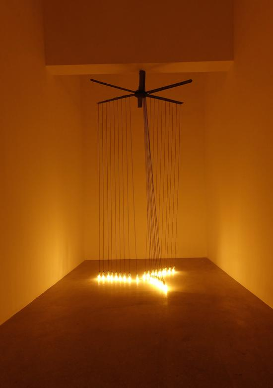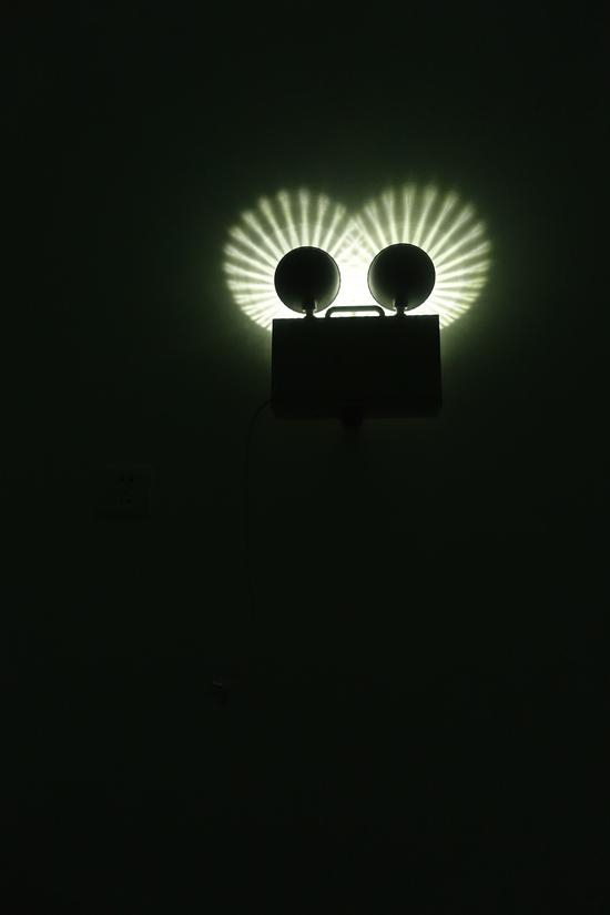 王恩来的创作材料主要来源于生活中的现成品。现成品作为工业社会的产品天然地带有符号意义,然而艺术家的作品弱化了材料的社会符号性而从物理层面切入关注于物质材料本身的特性。作品中的现成品一一组合,形成悖论式的绝配,这种绝配体现着构成意义上的临时性的关系。而媒介本身的物质特性引发的消解趋势终将使这一意识形态的临时关系付诸外化实践。此次展览中,电风扇、轮胎、玻璃、灯泡……这些现成品在艺术逻辑中被解构和重组,而形成不同维度、不同意义上的“临时关系”。