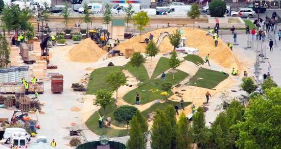 谁相信:现代的法式园林,一个迷宫花园,占地面积1500平方米,长120米,宽25米, 采用木材和草坪盖卷、以及350个金属支撑各不相同,利用铁锹、耙子、激光束,工作人员团结一致实现的GPS航点它独特概念的大小变形,大约90名园丁工作了五天组合而成,展示在众人眼前,官方新闻稿曾指出,此装置应该是“质疑自然与城市之间的联系,以及他们的艰难共存”。