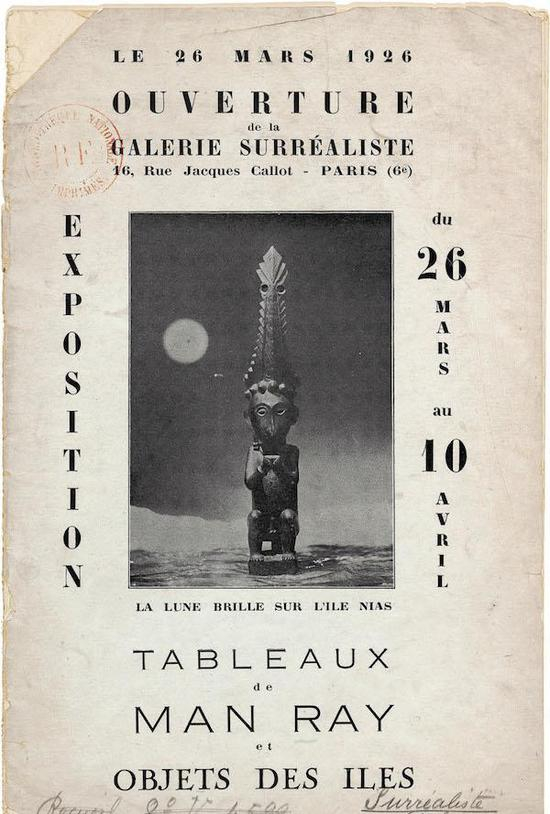 1926年,超现实主义画廊在巴黎落成。在题为“岛屿之物”的开幕展上,异域物品与曼·雷(Man Ray)的作品被并置一处。曼·雷的一幅摄影被赫然印在展览图录的封首。据艺术家本人介绍,这幅作品展现了大洋洲尼亚斯岛(Nias)上的一个月圆之夜,画面前景中是本次展览上的一件展品——来自尼亚斯岛的土著雕像。詹姆斯·克里福德(James Clifford)48用“人种学超现实主义”一词准确概括出了超现实主义文艺思潮的特点。与民族学研究不同,这场超现实主义美术展是一种以面具和稀有“物品”为对象的宗教祭祀,物品的阐释权归文学家所有。在这里,时代及来源方面的一切差异都被取消,因为这些“物品”完全是“超现实的”,很难像以往那样加以准确归类。与此同时,对面具的阐释也发生了逆转,正如克里福德对超现实主义运动所做的描绘,人们不假思索地“将面具与色情、异域和无意识联系在一起”。