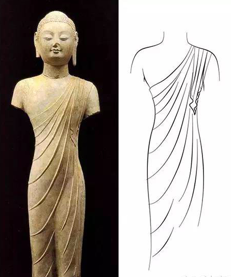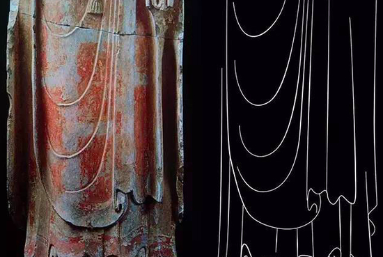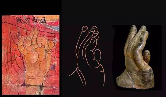 我们看到昭陵六骏,这些马的线条感和比例的处理,然后再对比一下绘画语言的表现,几乎都是一样的;再来看看那个著名的响堂山的佛手,每一个指节的线条都跟毛笔画出来的一样;还有很多佛像衣纹的处理,每一个褶皱的安排都是经由主观改造过的,和画中一模一样,那些饱含宏大智慧的佛造像正是通过这些独特的表现方式而最终达到了形神合一的超然地步。