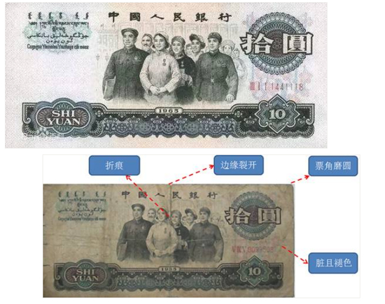 上面两张图是第三套人民币三罗马拾元的两种品相。通过对比可以看到,第一张基本无折痕,票面较干净,并且有一定的光泽,坚挺而不垂软,可以归到九品,根据当前市价水平,估计在130元左右可以卖出;第二张票角已经磨圆,票面较脏而且已经褪色,边缘撕裂,但图案细节仍可辨认,只能归类到五品,市价只能在40元左右。