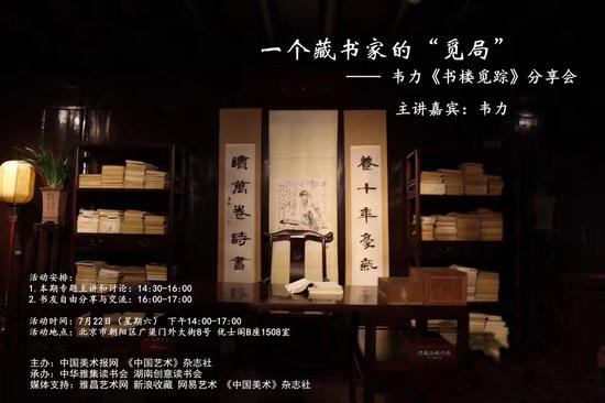 7月22日下午,由中国美术报网主办,中华雅集读书会、湖南创意读书会承办的一个藏书家的“觅局”暨韦力《书楼觅踪》分享会在北京双井举行,活动由资深媒体人、原人民网读书频道主编绿茶主持,特邀著名藏书家韦力给大家分享关于藏书文化的故事,现场气氛热烈、观点鲜明、内容新颖,尤其是涉及到韦力捡漏的故事更是为人津津乐道,本次活动更是得到了绿茶书情公众号、豆瓣同城、北大清华讲座等公益性组织对预告予以关注与报道,再次感谢。最后,本次活动也要特别感谢高子馨老师提供场地。