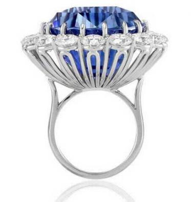 椭圆形的蓝宝石宛如一汪深不可测的蓝湖,周围镶嵌着的无数碎钻使整个戒指看上去璀璨夺目,溢彩流光,绝对是目前世界上最昂贵的钻石戒指之一。