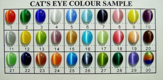 可能具有猫眼闪光的宝石种类很多,据统计可能多达30种,市场上较常见的除石英猫眼和金绿猫眼外,主要还有“辉石猫眼”、“海蓝宝石猫眼”,能产生猫眼效应的宝石还有碧玺、绿柱石、磷灰石、石英、蓝晶石等。