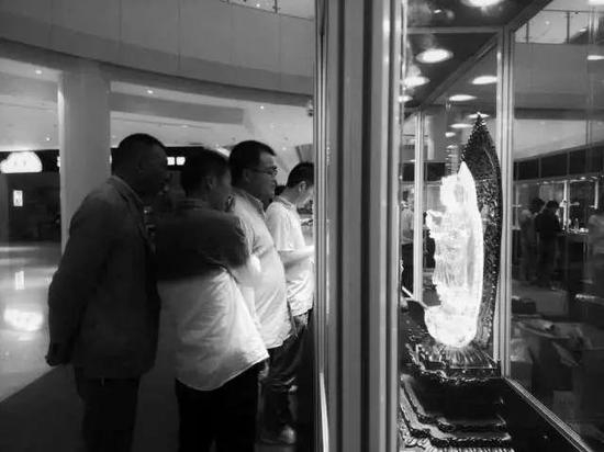 经过艰苦细心的运输,近1吨重的《大威德金刚》今日终于抵达东海水晶城。大威德金刚是主管智慧的文殊菩萨愤怒像,大威镇邪,大德佑善。这座由中国玉石雕刻大师仵应汶主持设, 襟抱斋成员历时11年协力完成的作品采用多种高难度的雕刻技法,实现了茶晶质地特征、天然美感、题材主旨与文化内涵的完美融合。作品遵循佛教的法理、仪轨,艺术效果卓越,气势磅礴,堪称匠心巨作,传世经典。