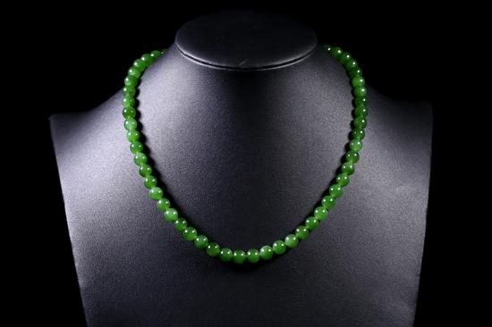 今晚的第四件拍品——和田碧玉项链,对于碧玉来讲,俄罗斯出产的碧玉料质优于新疆等地出产的碧玉,价格上也俄料也大大高于其他产地。此件拍品为正宗俄料和田玉碧玉,菠菜绿,一级颜色,几乎无黑点,部分带猫眼,十分难得。佩戴简约大气,极高观赏与收藏价值。