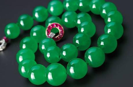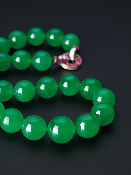 六年后,此项链再在香港上拍,成交价飙升至420 万美元(约3,300 万港元),升价逾一倍,亦再次把翡翠首饰的成交价推至另一高峰。时至今日,此项链仍然被誉为拍卖史上最贵重的翡翠饰品。雕琢翡翠向来“以素为贵”,而浑圆晶莹的玉珠正能表现上乘玉质之美;此项链上的“老坑”翡翠玉珠正正有着如此素质,其颜色浓而不悍、柔而不薄、润而不腻,堪称郁绿柔亮,拥有令人屏息震撼的魅力。一般而言,成就一条上乘的翡翠珠链须切割比珠链本身多至三倍的珠子以供挑选,而若要质色均配,珠子必须源出于同一块原石,因此耗料极多,矜贵难得。由于娇好的“老坑”翡翠石材珍稀,体积往往不大,因此能打造的翡翠玉珠直径一般只限于5 至10 毫米,而此项链上的27 颗硕大的玉珠直径至少有15.40 毫米,最大的一颗更达到19.20 毫米,且颗颗浑圆匹配,如葡萄般晶莹欲滴,绝对份量惊人,洋溢皇者气派。