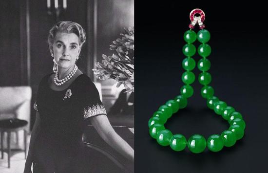 传奇名媛芭芭拉·赫顿是美国零售业巨子Frank Winfield Woolworth 的外孙女,她是少数以钟爱及收藏翡翠而闻名的西方名流之一。人称“亿万宝贝”的芭芭拉。赫顿在21 岁时已是全球其中一位最富有的女士,叱咤上流社会,一生绮衣灿烂,钟鼓馔玉,品味高尚优雅,其收藏包括著名珠宝品牌的珍贵订制精品,以及极为显赫的皇室贵族珠宝,当中包括法国皇后玛丽。安托瓦内特佩戴过的天然珍珠项链等。