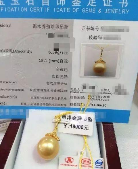 这颗金珍珠的证书中注明“不对该样品的颜色成因作检验”,这表明,该珍珠的颜色可能是天然的,也可能是人工改色的,此证书不能说明太多问题。这是因为金珍珠的改色可以采用辐照的方法,检测难度较大,建议大家遇到这个情况尽量到权威机构进行复检!