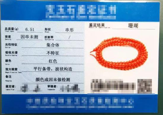 这是一串珊瑚珠链,一般来说,红珊瑚的颜色成因是很容易确认的,但是在这里,却备注说“颜色成因未作检测”。此时,我们就要非常小心,这串红珊瑚是极有可能经过染色剂染色而成!同样也建议大家到我们国检实验室进行复检!