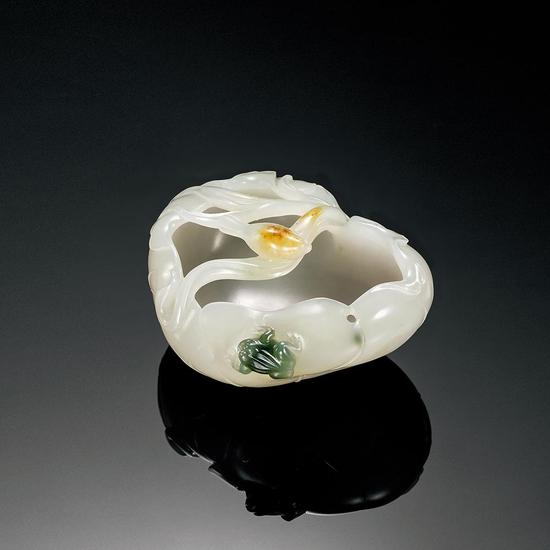 作品造型新巧,形似微卷的荷叶,观之灵动自然。作者妙借皮色巧雕出青蛙和鸟儿,只见青蛙趴在荷叶上,似要蹬足跳起。鸟儿栖于柔嫩水草上,似低头凝望什么。整件作品动感十足,满溢自然妙趣。