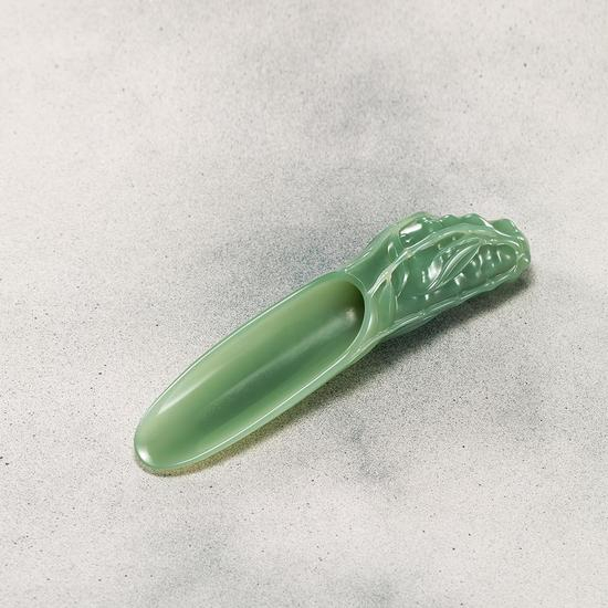 作品造型形似掏空的竹节,加上沙枣青的色彩,整体宛如一节青竹,观之秀丽清雅。作者在茶匙顶端浮雕出细嫩竹枝、竹叶,更显生动自然,同时也更方便使用者抓握,避免滑落。整