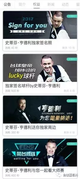 除了娱乐明星,亨德利作为体育明星首次与粉丝网以出售时间的方式合作,并且出售内容丰富,可以满足不同球迷的胃口。本次亨德利的时间售价为3.00元/秒,共15个小时。其中,亨德利独家签名照需消耗40秒,亨德利独家签名球杆需消耗500秒,亨德利送你独家周边物品需消耗350秒,亨德利与您一起看大师赛需消耗400秒,[VIP席]亨德利与您一起看大师赛需消耗700秒,与亨德利共享午餐/晚餐需消耗2000秒,与亨德利一起打球需消耗3000秒,亨德利专业指导台球课程需消耗3500秒。值得一提的是,这些时间可以像股票一样升值,可持有,可转售。