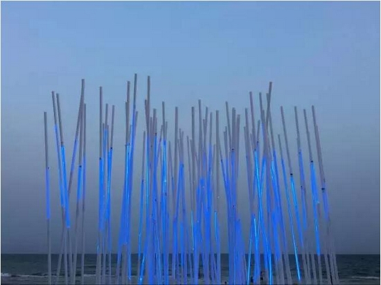 “通过播放心跳声配合灯光闪烁的频率,这个放置在家乡海滩上的艺术装置意在赋予海洋以生命的通感。”