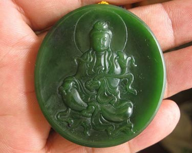 新疆和田玉碧玉颜色为菠菜青,这种玉料中带有黑色的墨点,而且墨点较大,且含有点状或带状的淡白色斑纹。按照质地的不同的不同而有着籽料、山水料和山料之分。