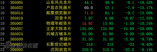 邮资封片板块21只上涨,28只下跌,交易额为261.88万,交易量为75238。新浪文交频道提醒:少数民主六运会片上涨55.10%,大坝会议片上涨11.27%,西湖博览会片上涨9.84%,水运会片等涨幅居前;山东风光本片下跌16.53%,湖县农民画片片下跌13.17%,邮票颁奖猴片下跌13.09%。