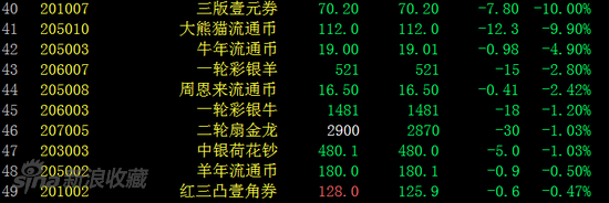 板块方面,钱币板块上涨16只,下跌13只,交易额为205.13万,交易量为103.37万。新浪文交频道提醒:藏品上53年无油壹分券上涨9.79%,二轮梅银蛇上涨9.49%,建国钞百联上涨8.89%;三版壹元券下跌10%,大熊猫流通币下跌9.9%,牛年流通币下跌4.9%。