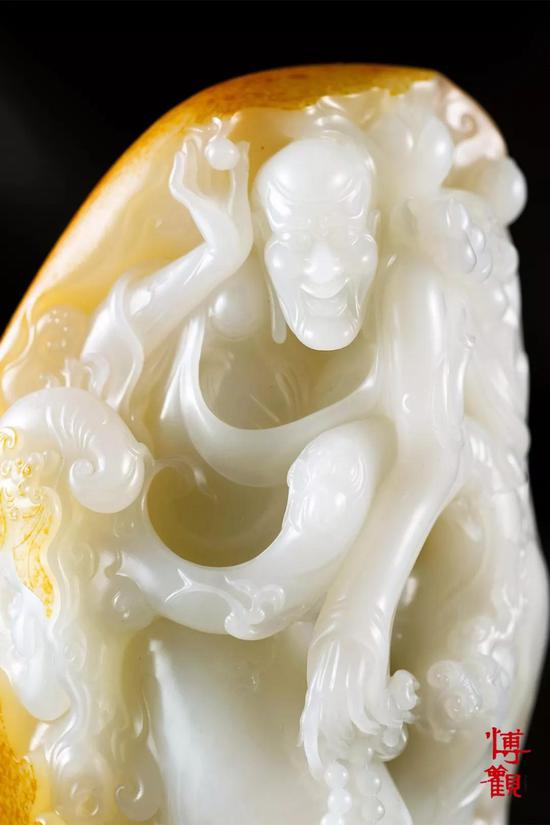 作品完全保留背部黄艳的皮色,正面玉肉莹白,罗汉右手持明珠举过头顶,左手持一串佛珠,且行且笑,古树上生出数朵灵芝,上更有莲花蔽日。罗汉额头前凸,佛手之相满满。长眉高挑,精神奕奕,喜笑颜开,表情自然不夸张,令人观之欣然。