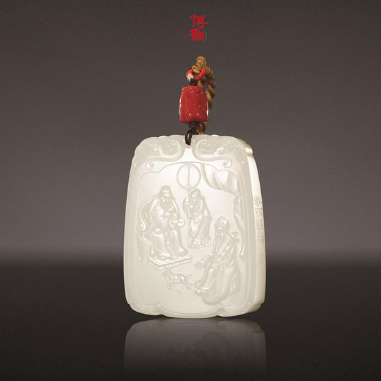 新疆和田籽料,质地细润,淡淡洒金皮与白润肉质相互映衬,更显大玉之美。一面牌首为双凤纹,婉转和熙,具凤仪天下之大美。开光处雕就‘张果老献宝图’,但见唐玄宗坐于太师椅上,身体前倾,手抚长须,神情愉悦。张国老坐于圆凳之上,与唐玄宗相视宝马良驹。雕工工整流畅,布局疏朗有致,画面感强烈。另面则虚实结合,浅浅破皮,雕琢为一只蝙蝠,留下更多的空间来展现原料洒金的皮色。侧边皮上雕刻“仁可长寿德可延年”。此外,此件作品传承有序,为2012年博观拍卖“玉艺凝华---上海杰艺玉雕珍藏艺术精品专场”拍品。