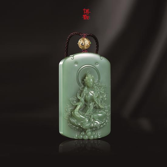 度母在藏传佛教中为观世音菩萨的化身,绿色代表度母之事业,绿度母为二十一度母之主尊,总摄其余二十尊化身之所有功德。作品选材于析木玉,玉质细腻,色彩柔和,工艺方面采用极细的高浮雕手法雕刻,且佛造像构图精准,十分贴合西藏唐卡之风韵,极具收藏价值。