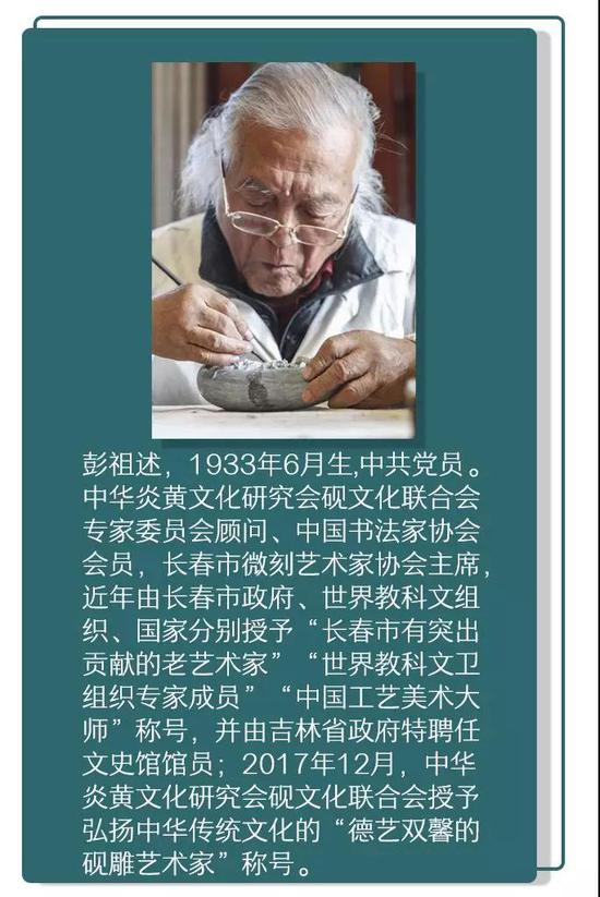 “我72岁的时候开始刻松花石砚,第一步就是到全国各地寻访刻砚大师拜师学艺,老了老了也要从徒弟开始。全国各地的名砚产地我几乎跑个遍,向各种砚的专家讨教交流,博采众家之长为我所用,前后行程2万多公里。”彭祖述笑着讲起自己“雕百砚”的开始。