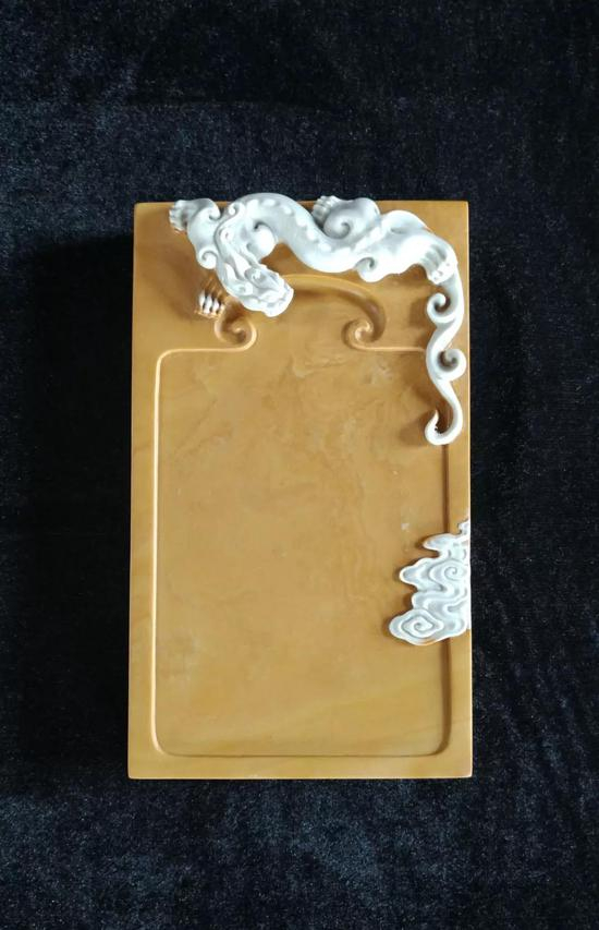 砚作深圆,形为苍穹,龙行穹顶,祥云伴生,云分双色,金玉相和,金螭回眸,玉海辽阔。