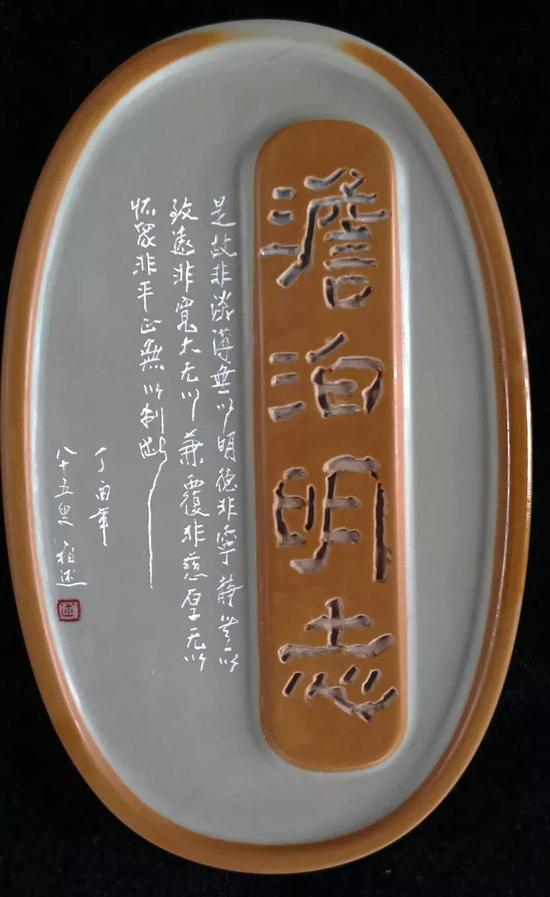 砚盖篆刻“淡泊”也是彭老旧作,砚背刻:“是故非淡泊无以明德,非宁静无以致远,非宽大无以兼覆,非慈厚无以怀众,非平正无以制断。”