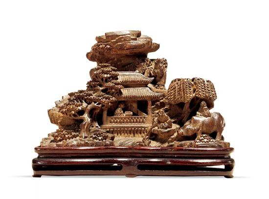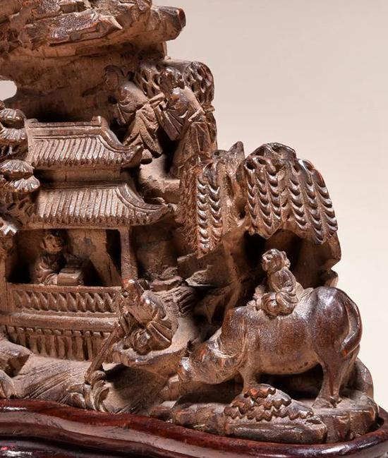 此山子独具文人画的审美情趣,表现文人对清雅闲适、自得其乐的理想生活的追求。雕琢层次分明,布局疏密有序,情景交融。将此山子置于案上,可添文房雅趣。