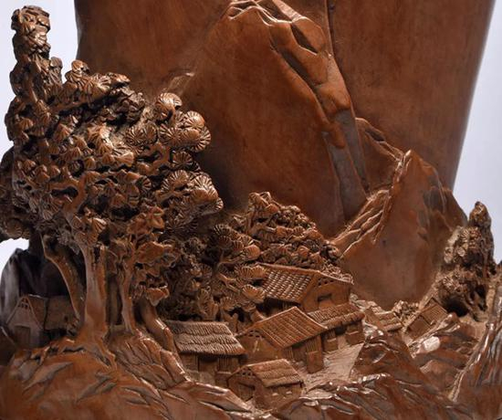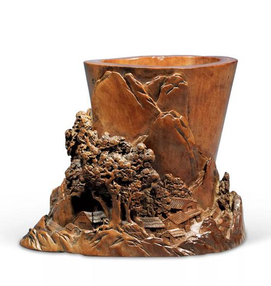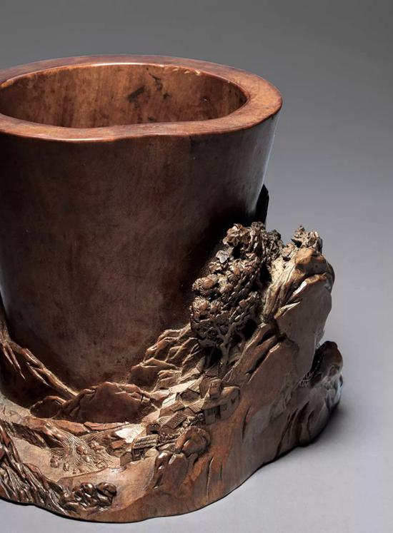 笔筒以黄杨木整料雕琢而成,随形巧妙设计,结合高浮雕、镂雕、阴刻等技法,通景环雕山水图,构图连贯,设计精妙。